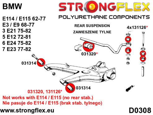 * BMW 5 E28, 6 E24, 7 E23 - existem dois diâmetros da bucha do braço traseiro, 27 mm (031314 ou 036232) e 44 mm (031693 ou 036235).